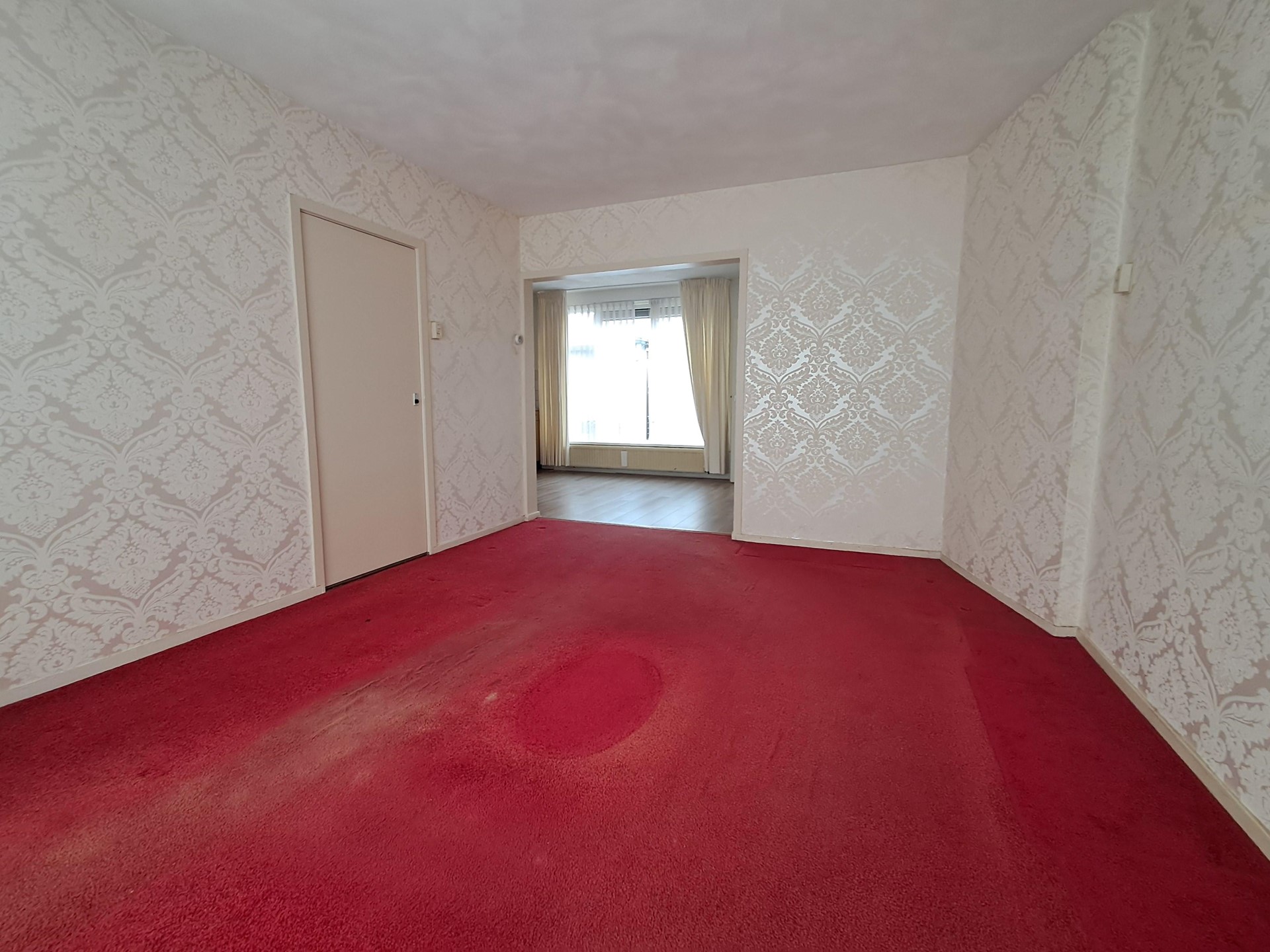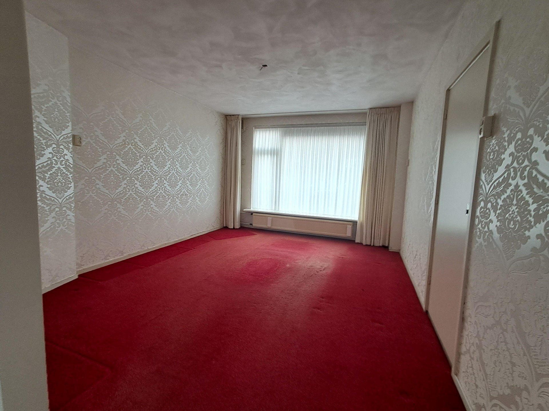 De wanden van de woonkamer zijn afgewerkt met behang, het plafond is gestukadoord, de vloer is afgewerkt met tapijt.