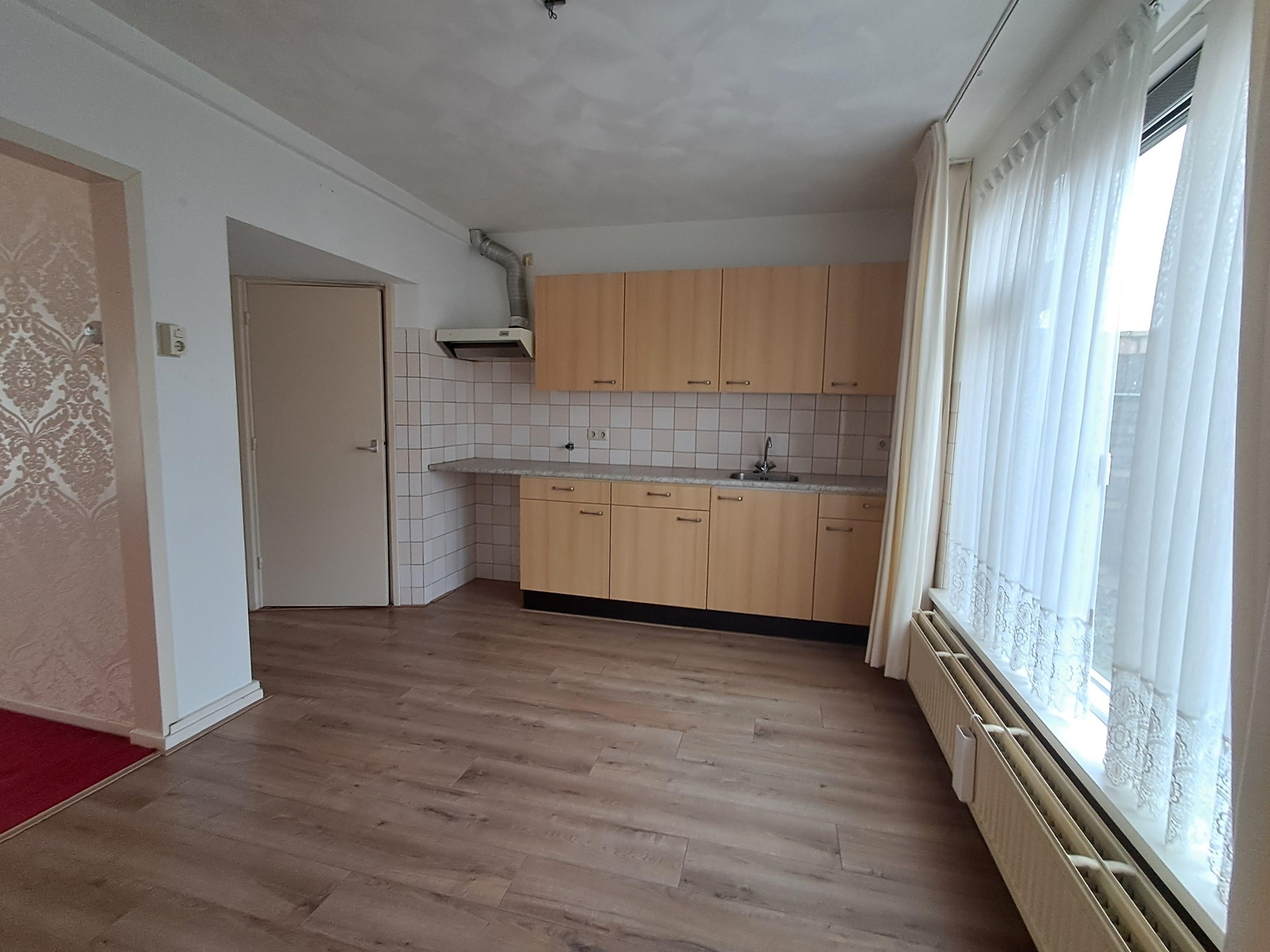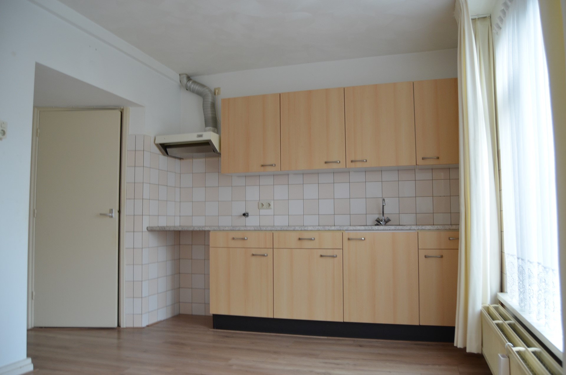 Open keuken (ca 13 m²) met trapkast en een eenvoudig keukenmeubel zonder inbouwapparaten;