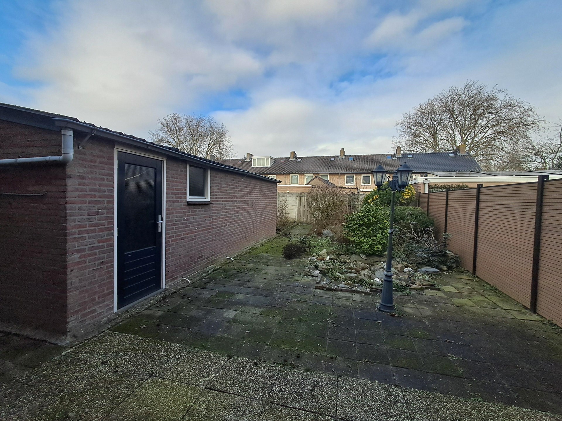 Achtertuin (Noord) met bestrating, planten en berging.