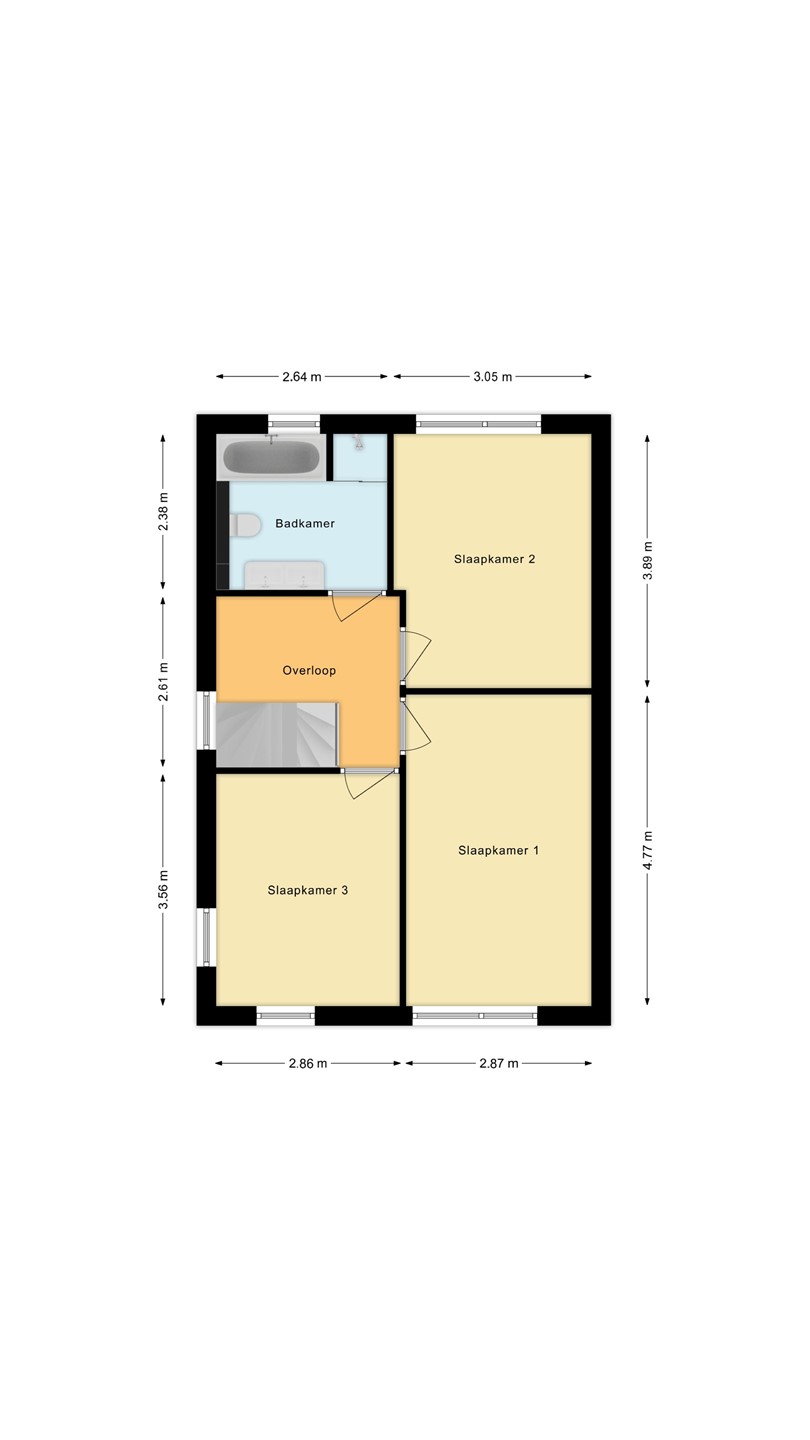 -Slaapkamer 2 ca 2.87 x 4.77 (ca 13,5m²) gelegen aan de achterzijde;