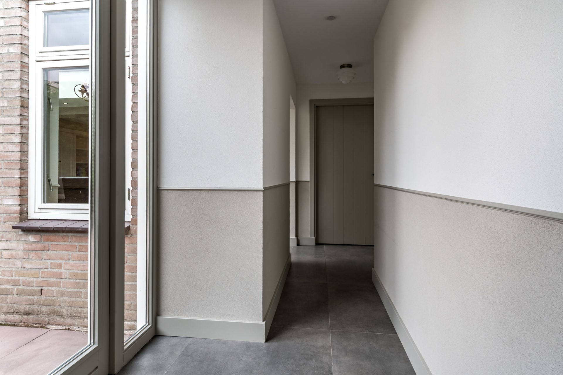 De wanden van de begane grond zijn afgewerkt met spachtelputz en stukwerk, de plafonds zijn gestukadoord (deels spuitwerk), de vloeren zijn deels afgewerkt met parket en deels betegeld (vloerverwarming).